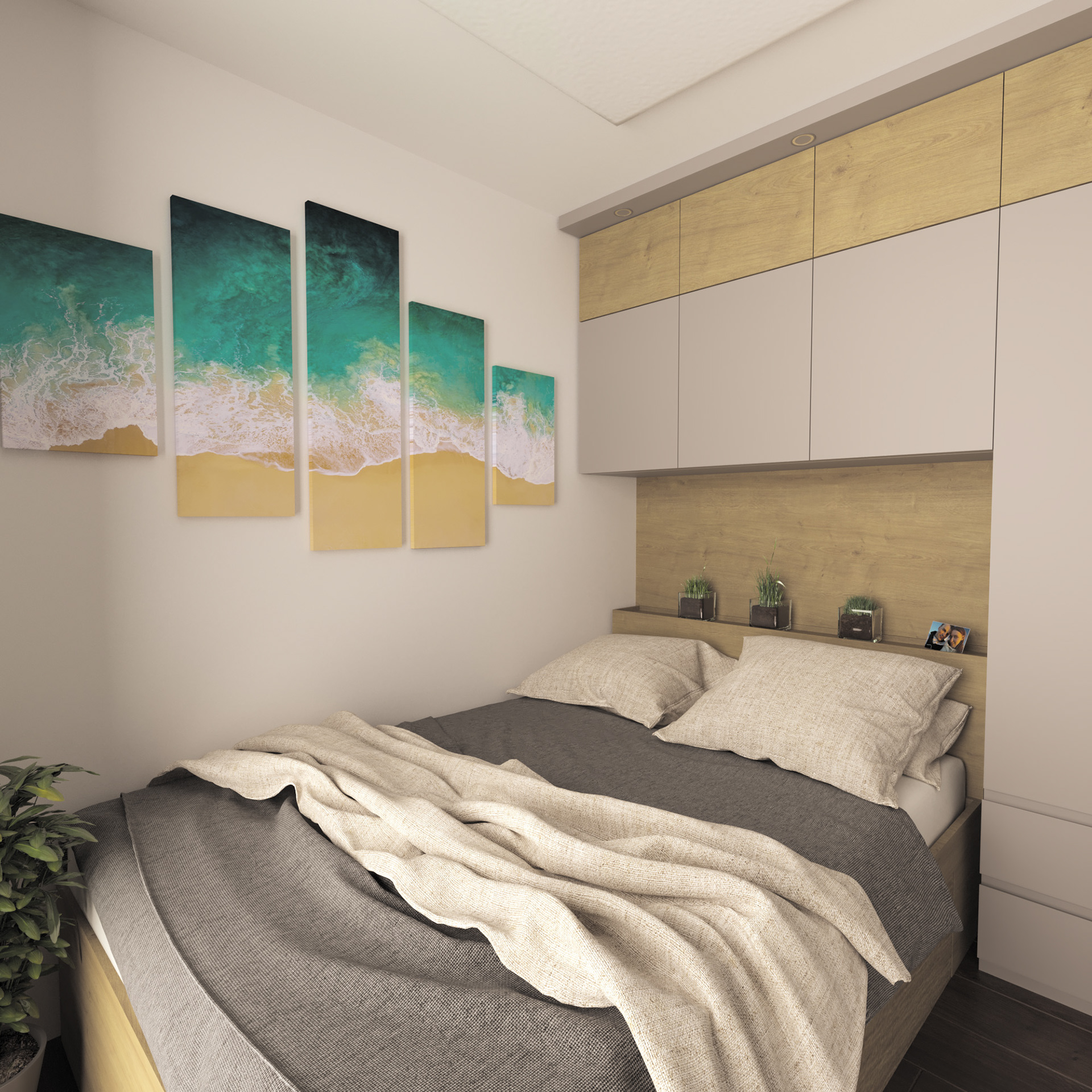 Przestrzeń za łóżkiem została wykorzystana na garderobę jednocześnie zapewniając dodatkowy element oświetlenia. Dzięki zastosowaniu panelu na podczerwień sufit stanowi jednocześnie źródło światła jak i ciepła, uwalniając powierzchnię użytkową zajmowaną przez klasyczny grzejnik.