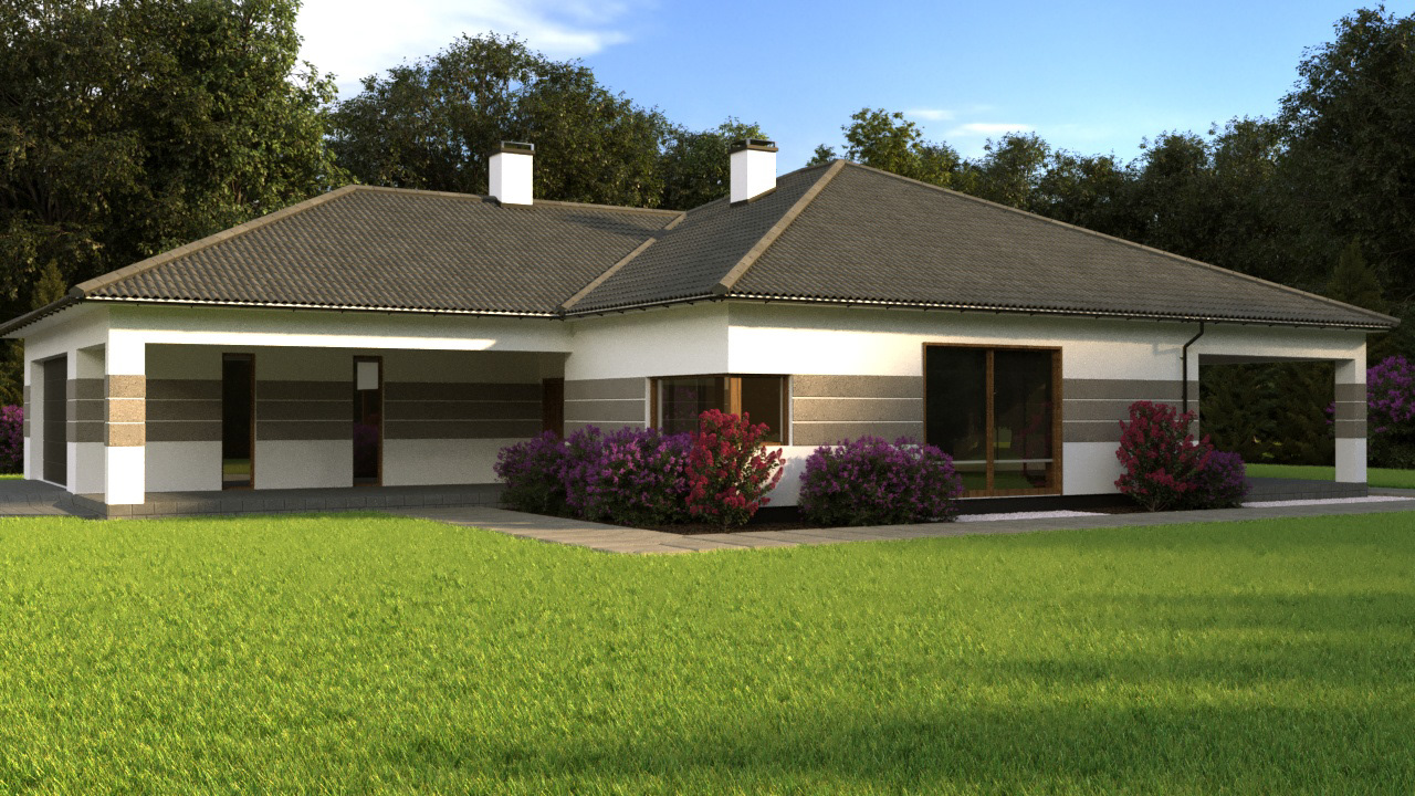 Wizualizacja parterowego budynku jednorodzinnego wykonana dla wolsztyĆskiego biura projektowego.