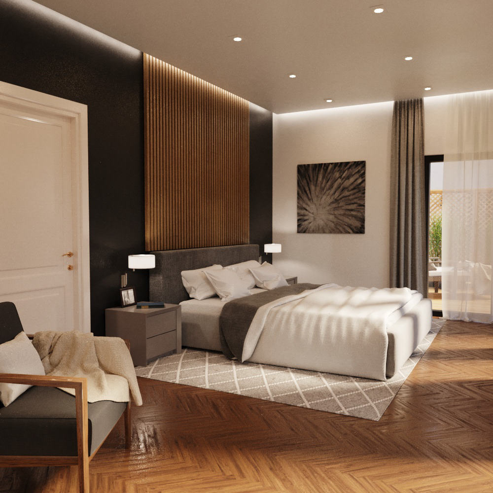 Projekt wizualizacji sypialni dla warszawskiego dewelopera.
